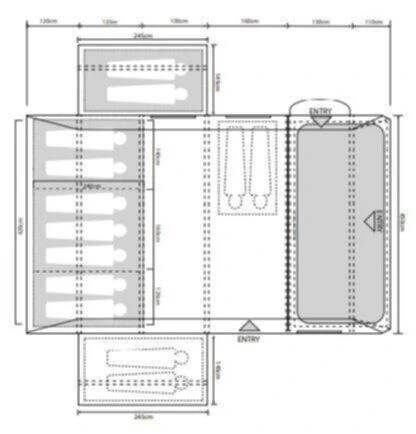 An exceptional family tent with masses of living space, the Outdoor Revolution Airedale 9.0DSE is further improved for 2023, offering dual side extensions, a fully inflatable design, and the footprint groundsheet and lounge liner included as standard with the package. The three-zone design of the Airedale makes it highly versatile to any family camper’s needs, as it offers unrivaled living space throughout the entire structure, with full standing height. The front porch area serves as an ideal “wet room”, an ideal place to dry clothing and boots after a long day’s activities outdoors. Further to this, the front porch serves as an ideal food preparation area, or an area to relax during the evening. The Airedale then has a large living space in the centre, with the groundsheet fully enclosed and sewn-in, ideal for keeping the bugs at bay and reducing draughts from the wind. The main sleeping quarters offer space for up to seven people and adaptable bedroom dividers to make the space into different configurations, with the ability to create three bedrooms in the main sleeping space if needs be. Additionally, the main bedroom has a depth of 240cm, making it perfect for camp beds and larger airbeds, without the need to position them sideways to fit them into the sleeping compartment.